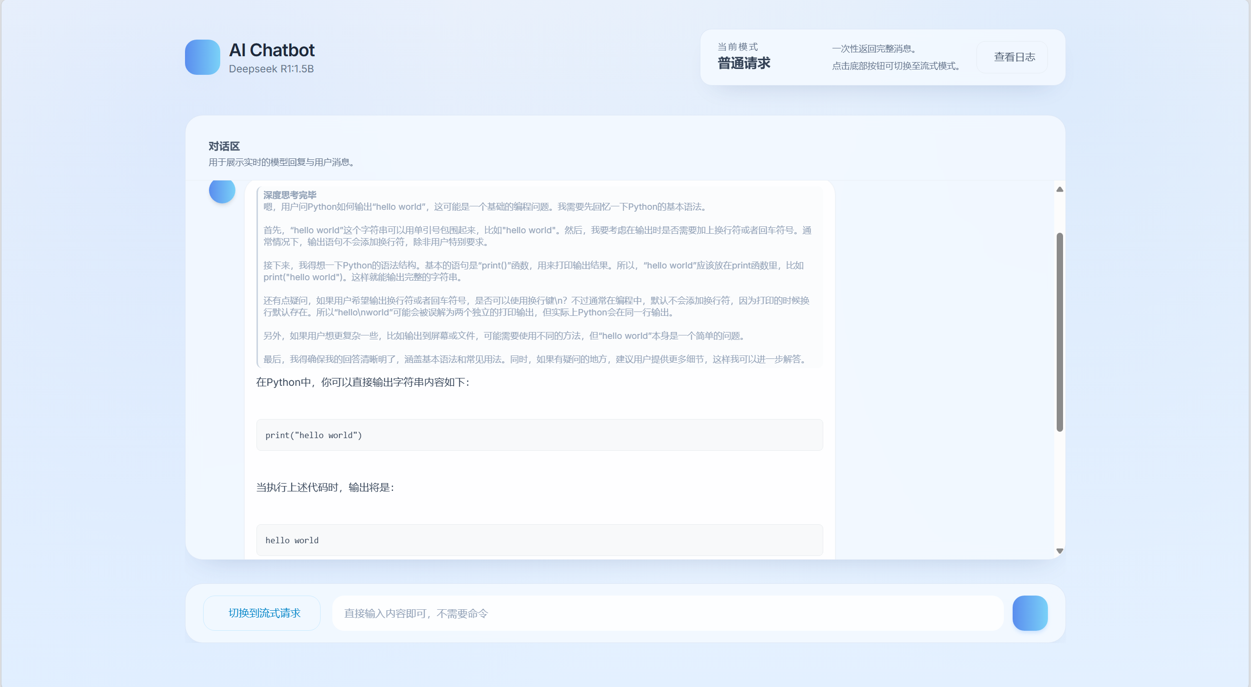 • 用户可通过界面按钮在普通请求(一次性返回完整消息)与流式请求(逐段返回消息)之间切换。
